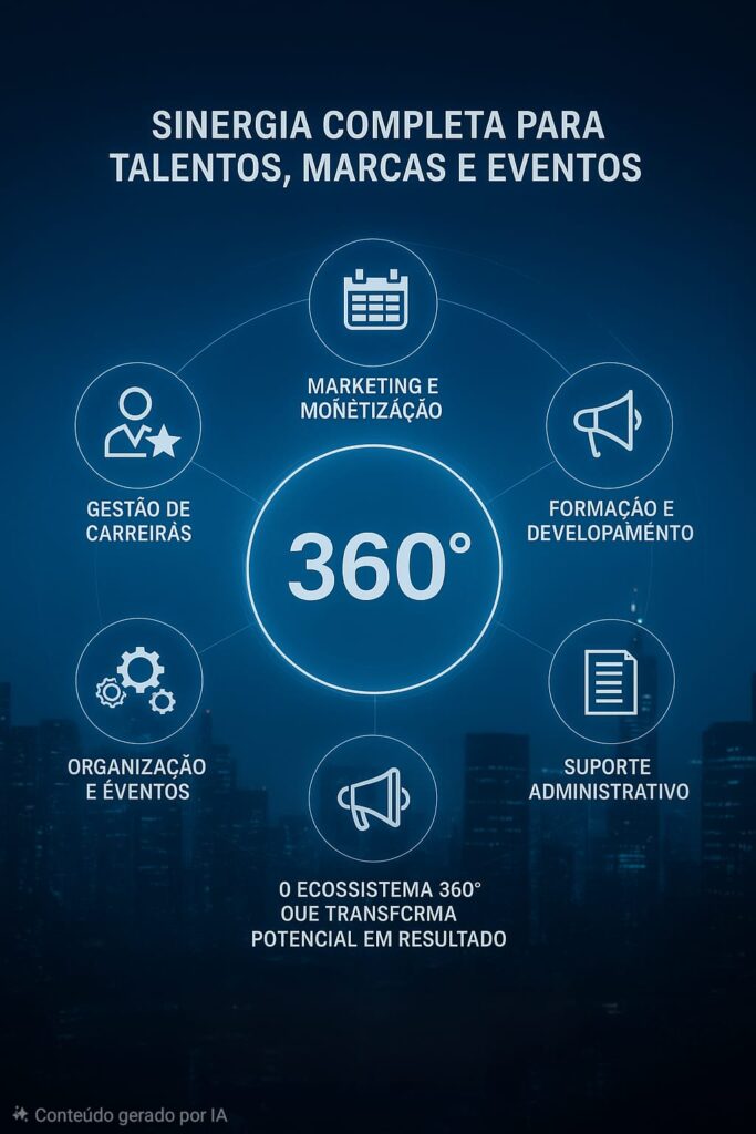 Visão Unificada: Um único ponto de contato. Uma única estratégia. Eficiência: Redução de custos e otimização de tempo ao centralizar todas as necessidades. Novas Oportunidades: Criamos ativamente novas fontes de receita cruzando nossos pilares de atuação. Pronto para levar seu talento, evento ou marca ao próximo nível?